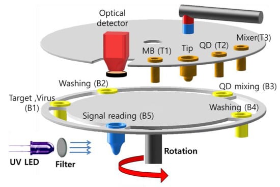 Structural parts including the top and bottom layers, a magnetic arm, and a top supporting structure were fabricated with a filament (silver metallic PLA) by 3D-printer 1 (Ultimaker3, Ultimaker BV, Utrecht, The Netherlands). For the disposable chambers and the tip, we used various materials to print chamber A (ABS-like resin, Cubicon, Seongnam, Korea), chamber B (Acrylic yellow + resin, Cubicon), chamber C (Cubicon ABS, Esun, Shenzhen, China), and chamber D (MODELING TAN V2, Apply Labwork, Torrance, CA, USA). To manufacture the chambers, 3D-printer 2 (3DP-110DS, Cubicon) was used for chambers A and B, 3D-printer 3 (Single plus, Cubicon) for chamber C, and 3D-printer 4 (Form 3, Formlabs, Somerville, MA, USA) for chamber D. The 3D-printed chambers were exposed to UV light for 15 min and were left in an oven at 65 °C for 48 h. Chamber E was a transparent 200-μL commercial polypropylene tube (MicroAmp Fast Reaction Tube, Applied Biosystems, Waltham, MA, USA). To prevent the adsorption of virus particles, MB, and QD2 on the chamber surface, the disposable chambers were coated with a 5% bovine serum albumin (BSA) solution and were washed by a PBS buffer. We selected the 3D printing method for its ease of design and fabrication and its ability to iteratively modify and customize with device components during the research phase. However, for mass production of the chambers and commercialization of the chip, micro-milling and polymer injection molding can be used []. Because of the structural simplicity of our system, such mass production methods would be easily applied.