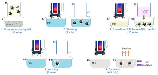 Schematic illustration of the sandwich immunoassay. The process consists of five steps. The reagent volumes are 70 μL each for the MB solution (T1), QD2 solution (T2), viral sample (B1), and PBS buffer (B3 and B5), and 210 μL for each washing buffer (B2 and B4).