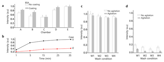 We studied the influence of the chamber material, incubation time, and washing procedure on virus detection to enhance the detection sensitivity. For all the cases, we used FluA/H1N1 virus suspension with a concentration of 3.2 × 10−1 HAU. First, we examined chambers A–E manufactured using various materials to prevent the adsorption of the MBs, QD2, and virus particles on the chamber surfaces. Once we selected a chamber with a specific material, it was used in Steps 1–4 (Figure 2). In Step 5, chamber E was used for the detection of the complex of MB–virus–QD2. Figure 3a shows the fluorescence intensity of the complex in Step 5. The BSA coating in chambers A and B increased the fluorescent intensities by 17.4% and 25.4%, respectively. This indicates that the BSA coating prevented the adsorption of the MBs, QD2, and virus particles on the chamber surfaces in Steps 1–4. However, regardless of the BSA coating, the fluorescent intensities in chambers A–C were lower than those in chambers D and E. As chamber D with the BSA coating produced a similar result to that of chamber E—which was the commercial tube—we used the BSA-coated chamber D in Steps 1–4.