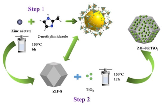 The composite of ZIF-8 and TiO2 was obtained as follows: 0.1 g of prepared ZIF-8 was stirred in 40 mL ethanol for 20 min. Subsequently, 0.2 g of TiO2 was added to the ZIF-8 solution and stirred for 20 min. Then, the mixed solution was transferred to a 100 mL PTFE container and sealed in a stainless-steel reactor. After sealing, the autoclave was heated to 423 K for 12 h [29]. The subsequent treatment of the material was the same as that of ZIF-8. The synthetic route of ZIF-8@TiO2 is shown graphically in Figure 1. The composite of ZIF-8 and TiO2 is referred to as ZxTy. Letters “Z” and “T” represent ZIF-8 and TiO2, respectively. The “x” (200, 150, 100, 75 and 60) and “y” (100, 150, 200, 225 and 240) are the mass percentages of ZIF-8 and TiO2, respectively.