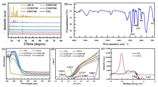 (a) XRD patterns, (b) FTIR spectrum, (c) UV-visible absorption spectra, (d) Optical band gap energy plots and (e) Valence band XPS spectra of ZIF-8, TiO2 or ZIF-8@TiO2 (ZxTy).