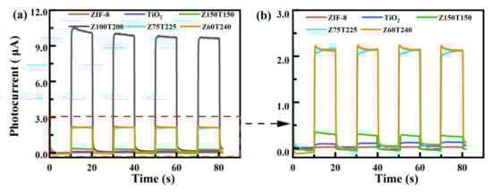Photocurrent tests were performed under intermittent light illumination to investigate the separation efficiency of photo-induced electrons and holes. The results are illustrated in Figure 4. As shown in Figure 4b, the photo-current intensities of bare ZIF-8 and TiO2 were 0.1 μA and 0.3 μA, respectively. The ratio between the ZIF-8 and TiO2 in the composites could affect the photo-current intensities. When the ratio was 1:1 (Z150T150), the current intensity was higher than the bare TiO2. When the ratio increased to 1:3 (Z75T225) and 1:4 (Z60T240), the current intensities were improved. According to Figure 4a, the photo-current intensity of Z100T200 was 10 μA, suggesting that the composite ratio of the ZIF-8 and TiO2 is not a single factor affecting the performance, which is also related to the morphology and structure of the material. According to Figure 2, it could be inferred that when the ratio was 1:2 (Z100T200), the TiO2 showed a more uniform load. The synergistic combination between ZIF-8 and TiO2 could weaken the recombination between electrons and holes [39,40]. Thus, the lifetime of photo-induced carriers could be increased. This result was also relatively consistent with the relationship of band gap width of ZxTy in Figure 3d, further confirming that Z100T200 has superior catalytic performance.