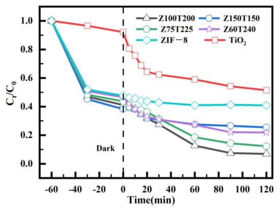 As illustrated in Figure 3d, the band gap widths of ZIF-8 and TiO2 were 5.08 eV and 3.26 eV, respectively. When the ratio between ZIF-8 and TiO2 was 1:2, the value of the band gap reduced to 3.06 eV. The reduced band gap energy is beneficial to improving photocatalytic efficiency. Thus, the results indicated that the photocatalytic efficiency of Z100T200 was higher than the bare TiO2, which might exhibit the highest efficiency.