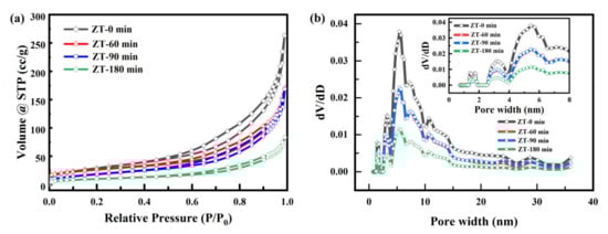 N2 adsorption/desorption isotherms (a) and pore size distribution (b) of Z100T200 at different catalytic time.