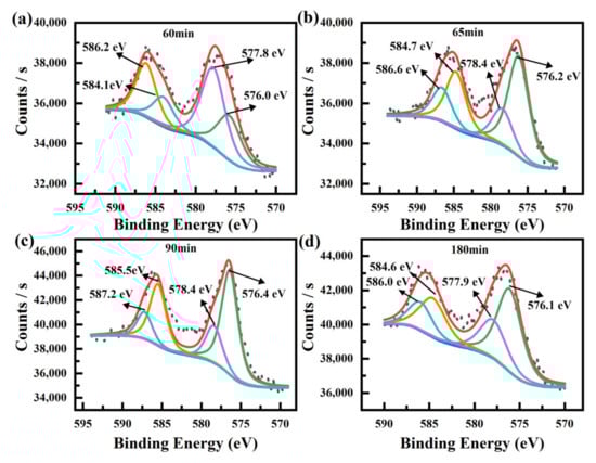 The XPS technique is used to analyze the chemical composite during the removal process to further confirm the reaction process and the results are shown in Figure 7 and Table 3. As illustrated in Figure 7a, after the 60-min dark process, the Cr2p region could be fitted into two pairs of peaks. The peaks located at low binding energy (576.0 and 584.1 eV) correspond to Cr(III), and the other pair peaks at high binding energy (577.8 and 586.2 eV) originated from Cr(VI). The appearance of peaks corresponding to Cr(III) indicated that the composite exhibited a weak catalytic effect under dark conditions. After 5-min irradiation, the valence state of adsorbed chromium was evidently changed. According to the fitting parameters of the XPS results listed in Table 2, the atomic ratio between Cr(VI) and Cr(III) was transformed from 1.73 to 0.37, indicating that almost 30% of the contents of Cr(VI) was reduced to Cr(III) during the five minutes. Meanwhile, as demonstrated in Figure 5a, during the first 5 min of the irradiation process, the concentration of Cr(VI) in the solution remained constant. These results demonstrate that during the initial stage of the irradiation [43,44], the reduced reaction due to the photo-electrons occurred at the adsorbed chromium priority. The reasons for this result are as follows: (1) The concentration of the chromium at the surface or pores of ZIF-8 was higher than the solution owing to the adsorption process. Thus, the ZIF-8 could act as a “micro-nano reactor” to accelerate the reaction rate. (2) The quantity and reactivity of the photo-electrons on ZIF-8 were improved due to the fabricated heterostructure between ZIF-8 and TiO2. According to the XPS results of the composite after 90-min and 180-min irradiation shown in Figure 7c,d and Table 3, the chemical composition barely changed, indicating that the reduced reaction mainly existed at the material–solution interface. Then, the adsorption process and reduced reaction occurred at the same time. This result was also demonstrated by the photocatalytic degradation curves shown in Figure 5. After the initial 5-min irradiation, the concentration of Cr(VI) in the solution decreased, following the prolonged irradiation time [45,46]. More information concerning the changes of chemical compositions during the whole process, such as XRD and FTIR, is shown in Figures S2 and S3.