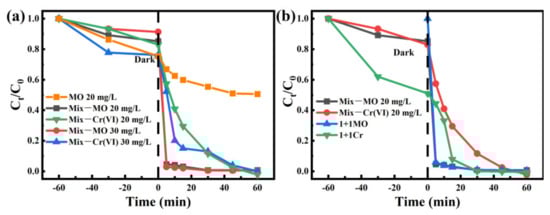 (a) Removal efficiencies of MO and Cr(VI) in mixture solution contained MO and Cr(VI); (b) The effect of MO addition type on Cr(VI) degradation, the sign of “Mix” indicates that MO and Cr(VI) was added into the solution at the same time, the sign of “1 + 1” indicates that MO was added into the Cr(VI) solution after a 60-min dark process.
