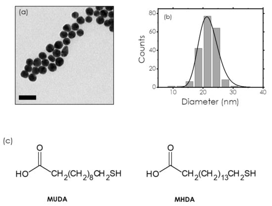 (a) Transmission Electronic Microscope (TEM) picture of nanoparticles stabilized with citrate prior to any thiol functionalization (scale bar 50 nm). (b) Size distribution of the nanoparticles and lognormal fit showing an average size of 21.7 (). (c) Chemical structures and abbreviation of the alkanethiols used in this study: 11-mercaptoundecanoic acid (MUDA) and 16-mercaptohexadecanoic acid (MHDA).