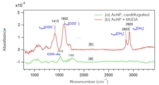 FTIR experiments were conducted with the pristine AuNP solution and with the AuNPs functionalized with 2 µM of MUDA. Both solutions were drop-casted on the silicon substrates. The two FTIR spectra are presented in Figure 2. Spectrum of Figure 2a of citrate-AuNPs shows a flat signal with only two features emerging from the noise. One peak is detected at 1519 cm−1, and other vibrations are visible around 1760 cm−1. The various features at 1760 cm−1 are remains of the stretching modes of water vapor that could not be totally suppressed. Due to the low amount of citrate, the noisy signal does not allow a clear identification of the peaks. Notice that for free citrate molecules, the asymmetric and the symmetric COO− stretching modes are detected at 1385 cm−1 and 1575 cm−1 [27,44]. Here, the peak at 1519 cm−1 may be assigned to the COO moiety in interaction with the gold atoms. Figure 2b shows the spectrum of MUDA-AuNP, and unlike spectrum (a), the molecular vibrations are easily visible. The C–H stretching modes of the methylene group of MUDA at 2853 and 2920 cm−1 are clearly identified. Two strong modes at 1413 and 1602 cm−1 are also detected, and these are assigned to the carbonyl of the carboxylate moieties of MUDA. On both spectra, the small bump around 1100 cm−1 is due to a slight oxidation of the substrate. These FTIR spectra confirm the functionalization of AuNPs with MUDA. The next section will quantify this functionalization.
