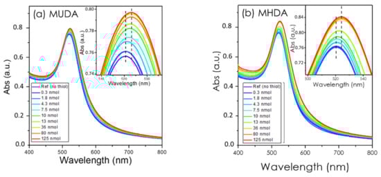 Surface saturation experiments consist in mixing aliquots of previously prepared thiols solutions to a solution of AuNPs and recording a UV-visible spectrum 15 min after each addition. Figure 3 shows the spectral evolution for an increasing concentration of MUDA (Figure 3a) and MHDA (Figure 3b). They clearly show the LSPR absorbance peak measured at 520 nm for spherical gold nanoparticles in a pure water solvent [45,46]. The exact values of λLSPR are reported in Table 1.
