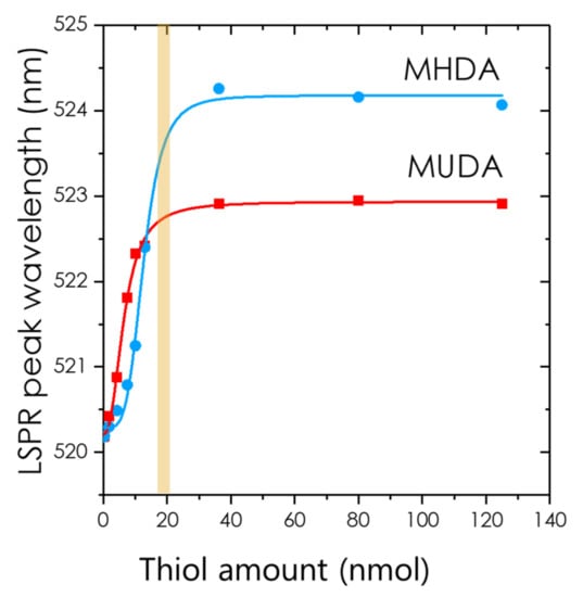 In the following, we have chosen to plot the LSPR peak wavelength as a function of the amount of thiol added to the initial AuNP solution (See Figure 4). Notice that instead of the LSPR shift, Van Duyne has explored the possibility of monitoring the evolution of intensity at the absorbance peak in the case of nano-triangles [52]. So did also Dahlin for spheres, but the sensitivity is achieved after heavy data processing [53,54]. Moreover, in some experiments, dilution processes or aggregation may blur the interpretation of the absorbance evolution compared to the wavelength monitoring. This is why we now focus on the LSPR wavelength shift.