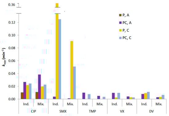 kapp values for PhAC degradation individually (Ind.) and in a mixture (Mix.) in MQ water and at a concentration of 2 mg/L.