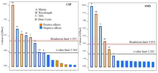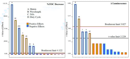 DoE analysis showed that the matrix (A) was the most significant effect in the Pareto chart for the overall degradation, expressed as %TOC decrease (Figure 4). Photocatalysis, like most AOPs, is highly dependent on matrix characteristics, and faster degradation is usually observed in MQ than in real matrices, which highlights the importance of pre-treatments for better performance []. Just like for individual PhACs, the BC (wavelength and catalyst presence) factor was highly significant and the highest mineralization rates were obtained with UV-A and a catalyst or UV-C without a catalyst. All effects involving duty cycle were not significant.