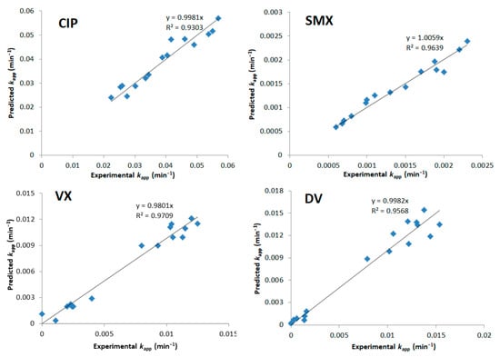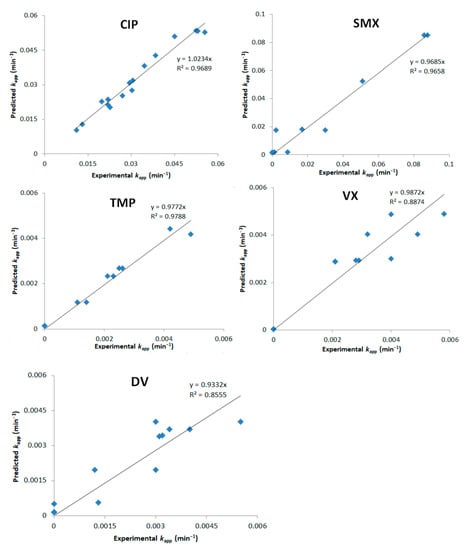 Plots comparing experimental kapp values with the ones predicted by Equations (4)–(8) are shown in Figure 3. It can be observed that VX and DV did not have a correlation model as good as the other tested PhACs. Possible explanations are the influence of other significant factors in the degradation of these compounds, such as the presence of degradation products and pH, which were not evaluated in the DoE.