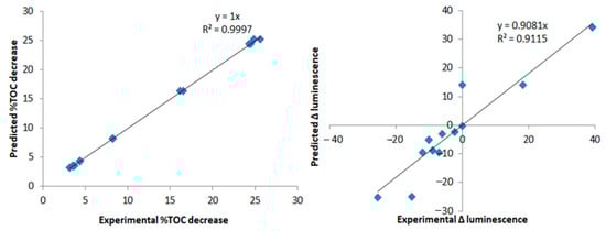 Figure 5 shows the model prediction for %TOC decrease and Δ luminescence, based on Equations (9) and (10) obtained from the design of experiments. %TOC decrease had an excellent fit. The prediction for luminescence had a lower accuracy but was still good, particularly considering how often prediction of toxicity involves much more complex and robust techniques, such as quantitative structure-activity relationship QSAR models [].
