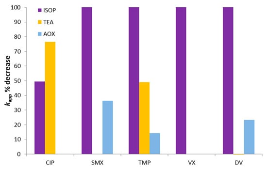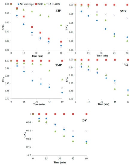 The hydroxyl radical was the most substantial contributor to the degradation of the pollutants, since the addition of ISOP completely hampered the degradation of four PhACs and reduced the CIP degradation rate by 50%. However, CIP was even further inhibited by TEA, indicating a high reactivity of this pollutant with super oxide radicals as well. The contribution of holes to the degradation was smaller, being relevant only for SMX, DV, and TMP, but always below 40%. Attention should be paid to the fact that a severe inhibition of the degradation does not mean that the compound is directly highly reactive towards the respective scavenger. This becomes evident by evaluating VX, TMP, and DV degradation, which was completely halted by the presence of isopropanol; however, in the latter’s absence, the reaction rates were also very low (Figure 1). The pH range in which the reactions took place (pH0 = 6.7, pHfinal = 5.7) can be a decisive parameter given that the amount of available radicals and holes depends on it [].