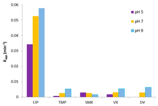 The exception was SMX, which degraded faster at lower pHs. This was probably related to the more prominent role of the neutral (and more reactive) form of SMX at pH < 5.6 (SMX pKa value) [,]. As was explained in Section 3.1, a CIP-predominant neutral ionic state tends to degrade faster at pH > 6.1. The same phenomenon can be observed for TMP at pH > 7.1. Since the pKa values of VX and DV are above the range of the experiments, their different reaction rates can be explained mainly by the increase of ROS species production in more basic environments.