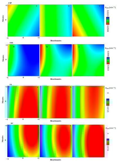 Surface graphs of kapp for CIP, SMX, VX, and DV. X-axis: coded bicarbonates; Y-axis: coded nitrates; a, b, and c of each row represents humic acids coded values of −1, 0, and +1, respectively.