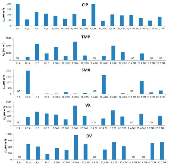 It is fundamental to analyze the energy expenses of the photolytic and photocatalytic processes and how they are affected by variables, such as wavelength, matrix, and controlled periodic illumination. It was not possible to include EEO in the previous DoE analysis because all values corresponding to kapp = 0 would tend to infinity. Figure 11 shows the EEO values of the five PhACs for different processes. The standard performances in MQ water were compared with cases using duty cycle and two varieties of simultaneous wavelength (SW). In the first one (P or PC, SW3 LEDs), two strips of UV-A LED and one of UV-C LED were used. In the second one (P or PC, SW6 LEDs), three strips of both UV-A and UV-C LEDs were used simultaneously. The objective was to analyze the possible benefit brought by additional light sources, controlled periodic illumination, and simultaneous wavelength on EEO, and to compare its results in MQ and tap water.
