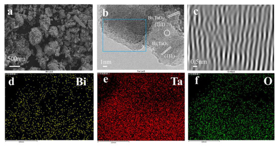 (a) SEM images. (b) TEM images. (c) FFT pattern image of Bi3TaO7−x in the selected area. (d–f) Corresponding EDS elemental mappings of Bi3TaO7−x.