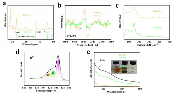 (a) XRD patterns of the Bi3TaO7−x and Bi3TaO7. (b) EPR spectra of the Bi3TaO7−x and Bi3TaO7. (c) Raman spectra of the Bi3TaO7−x and Bi3TaO7. (d) High-resolution O1s XPS spectra of the Bi3TaO7−x. (e) UV–vis spectra of Li2S6 solution with Bi3TaO7−x and Bi3TaO7 after treatment for 12 h. Insert image corresponds to the optical photograph of the above solution.
