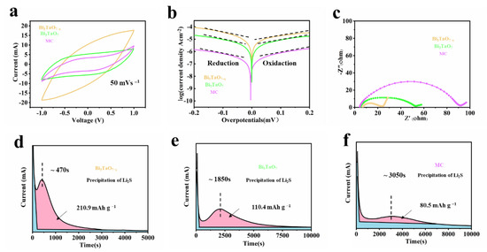 The electrocatalytic performance of Bi3TaO7−x, Bi3TaO7, and the MC reference was investigated using a series of electrochemical tests. To analyze the electrocatalytic activity of Bi3TaO7−x in the liquid–liquid process, CV curves of Li2S6 symmetrical cells are displayed in Figure 5a [29]. The Bi3TaO7−x exhibits the highest redox current response of 20 mA among these samples. In addition, the Bi3TaO7−x electrode delivers the highest exchange current density in both reduction and oxidation processes and the smallest Tafel slope at the same time, as shown in Figure 5b [30]. Compared with those of Bi3TaO7 and MC, the electrochemical impedance spectroscopy (EIS) measurement results show that Bi3TaO7−x possesses the lowest charge-transfer resistance (22 Ω) when compared with those of Bi3TaO7 (46 Ω) and MC (84 Ω), indicating its fast charge transfer and enhanced polysulfide redox kinetics, as shown in Figure 5c [31]. Finally, the kinetic analysis of liquid–solid conversion was studied using Li2S deposition experiments. A good kinetic of liquid–solid conversion is vital to guarantee capacity contribution. The chronoamperometry curves indicate that Bi3TaO7−x has the shortest incubation time (470 s) and the highest Li2S nucleation capacity (210.9 mAh g−1) compared to that of Bi3TaO7 and MC, as shown in Figure 5d–f. This can be attributed to the fact that Bi3TaO7−x with oxygen vacancies can reduce the energy barrier for Li2S nucleation and accelerate the conversion redox kinetics, indicating their superior electrocatalytic effect on boosting the conversion from liquid LiPSs to solid Li2S [32].
