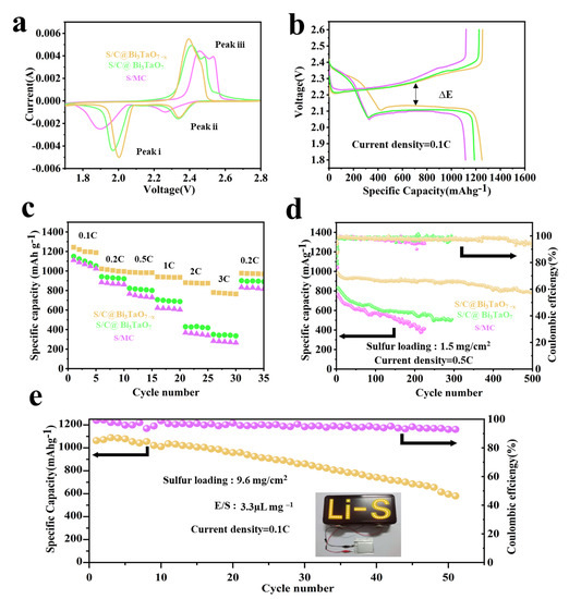 (a) CV profiles of coin cells at a scan rate of 0.1 mVs−1 employing Bi3TaO7−x, Bi3TaO7, and MC electrodes. (b) Charge–discharge profiles at 0.1 C of various sulfur electrodes. (c) Rate performance of different sulfur electrodes. (d) Long cycling performances of Bi3TaO7−x, Bi3TaO7, and MC electrodes at 0.5 C. (e) Cycle performance of the Bi3TaO7−x-based pouch cell at 0.1 C.