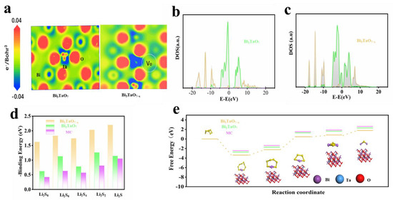 The effect of oxygen vacancies with Bi3TaO7 on enhancing the adsorptive and catalytic capability of Li-S batteries was investigated via density functional theory (DFT). Vacancy Engineering is an effective method to alter a surface electronic environment through the local redistribution of electrons. Furthermore, the introduction of surface defects could offer unsaturated bonds around vacancies to provide catalytically active sites [36]. Analyzing the charge density of Bi3TaO7 and Bi3TaO7−x in Figure 7a, the existence of the oxygen vacancies is shown, which are near Bi, Ta atoms. As shown in Figure 7b, there is a narrow gap near the Fermi lever after the formation of oxygen vacancies, indicating that Bi3TaO7 is a semiconductor with poor electrical conductivity.
