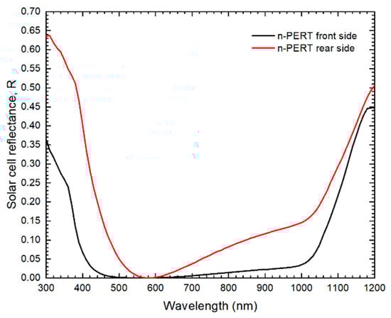 For validation, we used the experimental characterization of n-PERT solar cells, published in Ferrada et al. [27]. Table 1 shows the geometrical, doping and Shockley-Read-Hall (SRH) parameters of the cell, while the output current–voltage characteristics are shown in Table 2 (in the Results section). Values for the SRH carrier lifetimes were obtained from Edler [18] and Fell et al. [19] [1,28], while the metal fraction, , corresponds to the ratio of the cell’s front surface covered by metallization. In addition, the spectral reflectance (Rλ) of the metallized solar cell, shown in Figure 2, was obtained using a Perkin Elmer 950 Spectrophotometer [3]. See the Appendix A for the full parameter list.