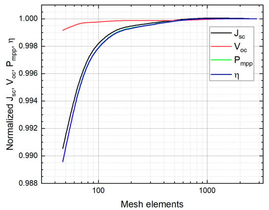 Mesh independence study of the main output JV parameters as a function of the mesh elements for a 1D model.