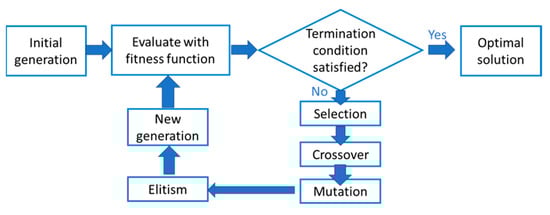 After implementing these steps, the next generation was obtained. Once the GA was finished, it led to the point , where was the last calculated generation. This solution is an approximation for the optimization problem. In general, this algorithm can rapidly find a zone near the global optimum. However, it can lack of precision [32].
