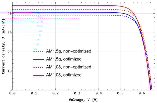Current–voltage curve of the optimized and non-optimized n-PERT solar cell at the AM1.5G and AM1.08 spectra.