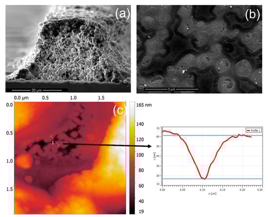 (a) SEM image of a silver finger of the n-PERT solar cell with a width around 50 µm and height of 10 µm after a single print. This structure was removed for the interface analysis. (b) Image of the SiNx etched area due to metallization; the light gray areas correspond to the etched areas (for further details, see [27]). (c) AFM image and depth profile of Ag imprints left behind after the chemical treatment.