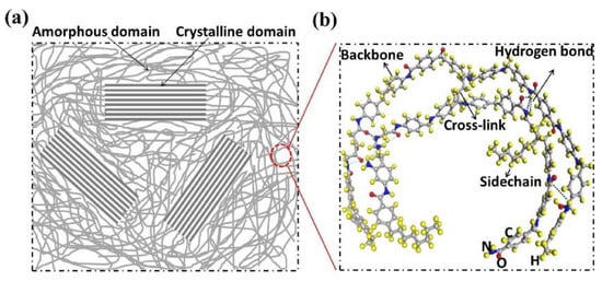 Schematic diagrams of a polymer: (a) the morphology of a polymer consisting of crystalline and amorphous domains; (b) structure of a polymer chain. Reprinted with permission from Ref. [49]. Copyright 2018 Elsevier.