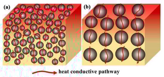 The particle size of the filler will affect the heat transfer inside the composite material to a great extent. At present, there is no conclusion about the influence of filler particle size on thermal conductivity. Firstly, in the view of forming heat conduction pathways, particles with smaller particle sizes are more conducive to heat transfer, because smaller particles can form more heat transfer pathways in a matrix, as shown in Figure 3a. Secondly, in view of interfacial thermal resistance, particles with small-size fillers possess a larger specific surface area, which will form more filler-matrix interfaces. When the carrier of phonon is transmitted in the composite material, phonon scattering will occur at the interface, resulting in interface thermal resistance. Therefore, the large particle size filler will reduce the area/amount of heat passing through the filler–-matrix interface, thus reducing the overall interfacial thermal resistance of the composites, as shown in Figure 3b. Different experimental results have been obtained on the effect of filler particle size on thermal conductivity. For example, Ren et al. [95] prepared spherical boron nitride with different particle sizes by spray granulation and applied them to polydimethylsiloxane. It was found that the particle with the size of 89 μm showed greater advantages in improving the thermal conductivity of the polymers. At the same loading of 50 wt%, the thermal conductivity of the composite reached 2.30 W·m−1·K−1, which was much higher than that of the particle size of 160 μm (about 1.75 W·m−1·K−1). The authors attributed this to the fact that the particles with smaller particle size exhibit higher particle packing density and promote heat transfer. However, Li et al. [96] studied the effects of boron nitride with various average particle sizes of 4 μm, 15 μm, and 27 μm on the thermal conductivity of polymers and found that the values of polypropylene composites increased with the increase of filler particle size under the same loading. The authors attributed this phenomenon to the fact that the filler particles with large particle sizes have a lower specific surface area and thus exhibit lower interfacial thermal resistance. In addition, the large-particle-sized particles were more likely to contact each other in the matrix to form a heat conduction network. The research results of Park et al. [97] showed that longer multiwalled carbon nanotubes were more efficient to improve the thermal conductivity of epoxy resin compared with shorter carbon nanotubes.