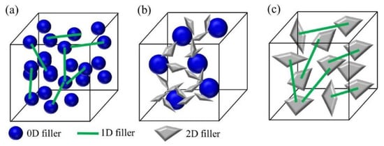 Schematic diagram of the network formed by the hybrid packings: (a) zero- and one-dimensional fillers, (b) zero- and two-dimensional fillers, (c) one- and two-dimensional fillers. Reprinted with permission from Ref. [49]. Copyright 2018 Elsevier.