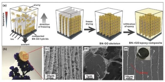 (a) Preparation process and (b) photograph of epoxy composites, (c,d) cross-sectional morphologies of boron nitride and reduced graphene oxide, and (e) cross-sectional morphologies of composites. Reprinted with permission from Ref. [153]. Copyright 2018 John Wiley and Sons.
