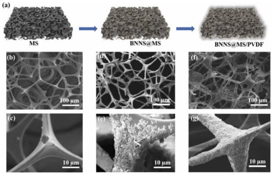 (a) Schematic illustration of BNNS@MS/PVDF, SEM images of: (b,c) MS, (d,e) BNNS@MS, and (f,g) BNNS@MS/PVDF. Reprinted with permission from Ref. [25]. Copyright 2022 Elsevier.