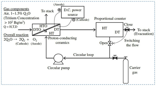 Due to their potential radioactive properties, low-level tritium detection is an imperative issue in tritium handling facilities. Recently, the development and utilization of various types of tritium monitors to control the background count of radiation, detection between HTO and HT, and tritium enrichment have been reported. Tanaka et al. (2004) [70] studied the extraction of hydrogen using argon with 20.7% oxygen content as fed gas to the anode under a wet air environment. The purpose of using this type of gas composition was to reproduce the operating environment of the tritium stack monitor. In addition, pasted platinum electrodes have been used, as the hydrogen evolution rate decreased under a wet oxygen environment for plated platinum electrodes [81]. The performance of the hydrogen pump was evaluated in terms of temperature, water vapor partial pressure, and gas flow rate. First, fed gas was supplied to the anode at 600, 700, and 800 °C, 3.5 V, and 91 mL/min. It was observed that the hydrogen evolution rate did not start before 700 °C. However, the maximum evolution rate was found to be 0.64 mL/min at 800 °C, and the rate of hydrogen recovery was 58%. Another parameter, e.g., proton transport number, which refers to the ratio of protonic current to total current, has been reduced to 0.52 due to electron-hole migration through an electrolyte with the proton. Under the above conditions, the hydrogen evolution rate was observed as 0.65 mL/min and 0.52 mL/min for a gas flow rate of 137 mL/min and 47 mL/min, respectively. However, the hydrogen recovery rate was much higher for 47 mL/min, e.g., 96%, whereas for 137 mL/min, it was only 38%. The dew point of water vapor was reduced to around 0.042%. Furthermore, the hydrogen evolution rate depends on water vapor partial pressure. It was reported that the hydrogen evolution rate and recovery rate were 0.67 mL/min and 60%, respectively, for 1.2% water vapor. The evolution rate increased by 1.15 times when water vapor partial pressure changed from 0.86 to 1.2% at 91 mL/min. As such, it is imperative to consider the fluctuation of the hydrogen evolution rate during the design of a tritium monitor using proton-conducting oxide. Figure 3 shows a typical schematic of a tritium monitor with proton-conducting material [70].
