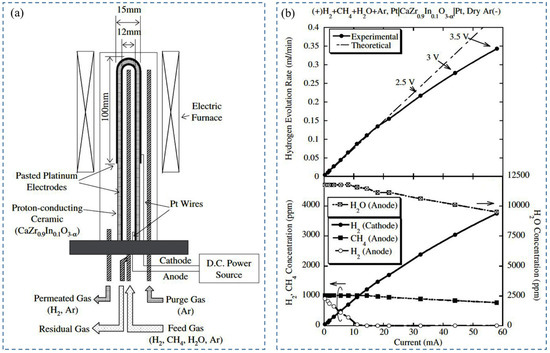In another study, Tanaka et al. (2005) [72] investigated the effect of electrode attachment procedures on hydrogen extraction from exhaust gas mixture (methane, hydrogen, and water vapor) by using CaZr0.9In0.1O3−α/SrZr0.9Yb0.1O3−α. The plated platinum electrode (4 µm, 1 µm thickness) and pasted platinum electrode were used to evaluate the performance of the hydrogen pump. To simulate the exhaust gas composition, argon gas containing 0.1% H2, 0.1% CH4, and 1.2% H2O-vapor was used as fed gas at 2 V. It was found that, at 800 °C, the evolution rate of hydrogen was 0.16 mL/min [93] for pasted electrodes, whereas for plated electrodes (4 µm), it was 0.46 mL/min, and 0.74 mL/min by CaZr0.9In0.1O3−α and SrZr0.9Yb0.1O3−α, respectively. The lower hydrogen evolution rate for pasted electrodes was attributed to methane oxidation, where the water vapor’s electrolysis produced oxygen, but for plated electrodes, the decomposition of methane and water vapor enhanced the hydrogen concentration (to 0.5%) on the anode side, leading to a higher evolution rate of hydrogen. On the other hand, in water vapor electrolysis with SrZr0.9Yb0.1O3−α electrolytes under a wet argon environment, the total current increased, but the hydrogen evolution rate was not increased for plated platinum electrodes (4 µm). The flow of electron holes through the electrolyte along with proton was the reason for this phenomenon. Porous pasted electrode and plated electrode (1 µm) may reduce electron-hole flow and increase proton flow by providing a better diffusion path for oxygen from the electrode–electrolyte interface to the outside of electrodes. Therefore, the pasted platinum electrode is useful for H2O-vapor, whereas the plated platinum electrode is useful for H2 and CH4.