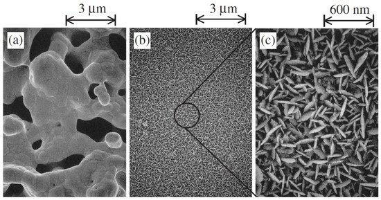 Later, to enhance the hydrogen extraction rate and electrode reactions for real-time application, Tanaka et al. (2004) adopted a new technique of preparing electrodes that includes electroless platinum plating on yttria-stabilized zirconia (YSZ) instead of using platinum paste [81]. For hydrogen pump and water vapor electrolysis experiments, wet argon gas with and without 1% hydrogen was used as fed gas into the anode. The applied voltage was between 2 and 0 V. SEM showed that the plated electrode surface consisted of small particles and pores of about 10 nm in size, while the pasted surface consisted of 1 µm pores (Figure 7) [80]. It was reported that the hydrogen evolution rate in the hydrogen pump increased by 3.2 times and the current increased by 3.5 times for plated electrodes compared to the pasted one. This phenomenon was attributed to the presence of a highly dense three-phase boundary due to the small particles. On the other hand, in the experiment of water vapor electrolysis, the current increased 1.5 times, but the hydrogen evolution rate decreased by 10%. With the presence of small pores on the plated surface, oxygen cannot diffuse easily into the electrode–electrolyte interface, which eventually increases the partial pressure of oxygen in the anode. As a result, electron-hole current increased, and “current efficiency” became less than unity, so the hydrogen evolution rate decreased.