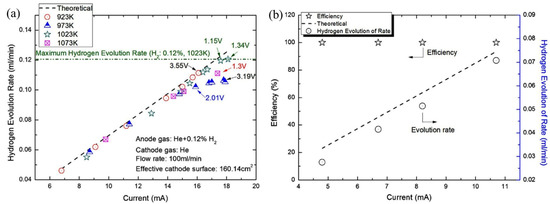 Tirui et al. (2014) [80] also used tube-type CaZr0.9In0.1O3−α to extract hydrogen efficiently and economically by an electrochemical hydrogen pump. According to Faraday’s law, hydrogen extraction was performed from the mixture of He and H2 at a voltage of less than 3.5 V DC. Various parameters, such as hydrogen concentration, temperature, current density, and voltage control hydrogen extraction, were used. It was found that higher hydrogen concentration enhanced the performance of the hydrogen pump. For example, at 2.35 V, 973 K, and 664 ppm, the hydrogen evolution rate was found as 0.0672 mL/min whereas for 2.61 V, 973 K, and 1128 ppm, it was 0.1046 mL/min, which indicates a 55% increase in hydrogen evolution rate. The performance of the hydrogen pump was characterized by the temperature range 873–1073 K, but the maximum hydrogen evolution rate was 0.12 mL/min at 1023 K, while the H2 and current density were 0.12% and 0.113 mA/cm2. Although the maximum H2 evolution occurred at 1.34 V, it coincided with the theoretical value at 1.15 V (Figure 8a). Figure 8b shows the hydrogen evolution rate against the applied current [80]. In addition, under these conditions with the feed gas flow rate of 100 mL/min, the efficiency of hydrogen evolution of the hydrogen pump was recorded as higher than 99%, and the transportation number was around 1.0. Furthermore, the estimated electrolytic current and number of ceramic tubes were reported as 9.46 × 10−3 A and 25, respectively, for the CIPITISE-TSE application at CIAE.