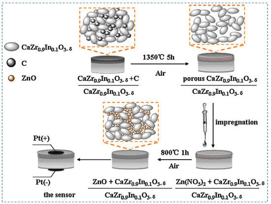 The performance of amperometric hydrogen sensors primarily depends on the electrolytes and sensing electrodes. Among the proton-conducting electrolytes, In3+-doped calcium zirconate is chemically stable and has been used in hydrogen sensors [104,105]. On the other hand, the performance of nanostructured ZnO as sensing electrodes has been studied recently [106,107,108,109]. Dai et al. (2012) [83] have proposed an amperometric hydrogen sensor with a bilayer proton conducting electrolyte, CaZr0.9In0.1O3−α, and ZnO electrode as sensing materials. Figure 10 shows the fabrication process of the proposed hydrogen sensor [83]. The principle of the sensors is based on current measurement in the case of applied voltage on the nanostructured ZnO anode. From the XRD pattern, it can be concluded that CaZr0.9In0.1O3−α is stable under pure CO2, H2, and wet Ar atmospheres. Arrhenius’s plot of the proton conductivities of the electrolyte shows that it has a good proton conductivity, making it an excellent choice for hydrogen sensors. After using ZnO as a sintering aid in the electrolyte, it is noticed from SEM images that ZnO effectively densifies the electrolyte. ZnO also helps to improve the sensor response by increasing the reaction sites due to its porous nature. I–V characteristics of the sensor exhibit the reversibility property, and the current response increase when the hydrogen concentration changes from 0 ppm to 500 ppm. The amperometric transient graphs show that the response time and recovery time increase with the increase in temperature because of the higher electrochemical kinetics at increased operating temperature. The response/recovery times are inversely proportional to the gas flow rate. Loading of the sensor materials also has an impact on the sensitivity of the sensor. ZnO 5 mg exhibits a higher current response compared to the 2 mg of ZnO loading. The hydrogen sensor is also stable under extended exposure to hydrogen gas at 700 °C. Further research is needed to improve this sensor’s sensitivity and long-term stability.