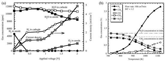 (a) Variation of current density and gas concentrations at the outlet of the anode and cathode as a function of applied voltage, (b) gas concentration change at the outlet as a function of temperature; here hydrogen, methane, carbon monoxide, carbon-di oxide, and water vapor are shown. Reprinted with permission from Ref. [97]. Copyright 2010 Elsevier.