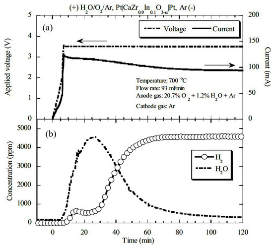 Later, Tanaka et al. (2006) [71] studied the effect of a combination of a pasted platinum electrode as an anode and a plated platinum electrode wrapped with gold mesh as a cathode with CaZr0.9In0.1O3−α electrolyte in a hydrogen pump. During performance testing, wet argon gas (1.2% water vapor) with 20% oxygen was supplied to the anode, and dry argon gas to the cathode at 100 mL/min, 923 K, and 2 V. In these conditions, the maximum evolution rate of hydrogen was observed due to the flow of current through the whole surface of the cathode (Figure 4a) [71]. Afterward, hydrogen enrichment in a closed-loop system was executed using this setup. Different percentages of water vapor concentration—0.7%, 0.86%, 1.2%, and 1.7%—were tested (Figure 4b) [71]. With the increase in water vapor concentration, the current decreased slightly, enriched hydrogen concentration increased, and the hydrogen evolution rate decreased with time. The enhancement in hydrogen concentration can be depicted by the increase in proton conductivity, which eventually decreases total conductivity. The reduction in the H2-evolution rate was demonstrated by the enhancement of electrochemical hydrogen potential on the cathode side, so the performance of the hydrogen pump was not improved by hydrogen concentration enrichment below 1.7% in the closed-loop system. It was also reported that for extracting full water vapor under the described experimental conditions, the required electrode is 75 cm2.