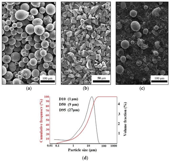 Morphology and particle size of the initial powders and their compositions. Powder morphologies: AP-NiCr17Si4B4 (a), B4C (b) and their composition after mixing (c). Particle size distribution of NiCr-70B4C powder composition (d).
