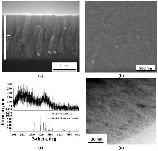 In the process of magnetron sputtering, the plasma of the magnetic discharge burns steadily without pulsation. Spraying of a metal–ceramic composite target for 60 min forms traces of annular erosion on the surface of the target. The size of the erosion is uniform over the entire surface of the metal–ceramic composite target. Smooth, dense and continuous NiB-Cr7C3 coating with a black color with a green tint on the surface of a 65G steel substrate was obtained by magnetron deposition using the obtained target with a coating of NiCr-70B4C. NiB-Cr7C3 coating has a thickness of 2 μm (Figure 5a). The coating material has a nanocrystalline structure, and at the late stages of growth, acquires a textured poly-crystallinity with a size of 100–150 nm (Figure 5b).