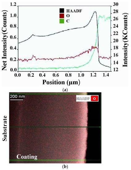 It can be seen that the concentration of oxygen and carbon increases from the “substrate–coating” boundary to the surface of the coating (Figure 6). Two spikes in oxygen levels are also fixed on the spectrum. The first increase in oxygen concentration (coating thickness ~250 nm) is due to the residual presence of oxygen on the surface of the substrate before coating.
