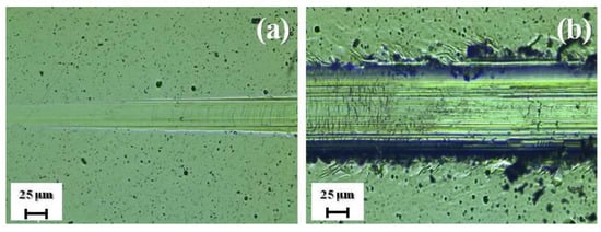 The second important characteristic of the mechanical properties of coatings is their adhesive strength. In this paper, for its definition, the method of scratch testing was used. Figure 8 presents the start and end points of the scratch groove formed on the surface of the coating at a progressive load range from 0.9 to 40 N. The coating was not delaminating completely up to a progressive load of 16 N, and the failure of the coating was found in the plastic deformation format. The wear in the coating areas is smooth and with no well-defined cleavages, which is typical for plastic abrasion (Figure 8). When scratched, the coatings become worn out but do not peel off, which is evidence that the cohesion mechanism related to plastic deformation and fatigue facture in the coating material is implemented [29].