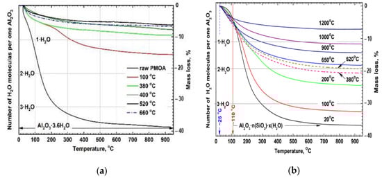 Molecular ratio H2O/Al2O3 and relative mass loss for: (a) monolithic raw PMOA sample and the samples pre-annealed at the fixed temperature and cooled down in humid air (except the powder sample PMOA pre-annealed at 660 °C) [11]; (b) monolithic PMOA-M sample and the samples pre-annealed at the fixed temperature and cooled down in humid air. From the comparison of the mass loss curves, it follows that a noticeable dehydration of the PMOA-M samples begins at the temperatures ≥110 °C and almost immediately upon heating for the PMOA samples without chemical surface modification.