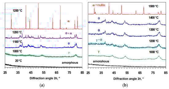 The structural changes and phase transformations in PMOA and PMOA-M samples were studied using X-ray diffraction methods in the temperature range of 100 to 1600 °C after isochronous 4 h annealing (Figure 3).